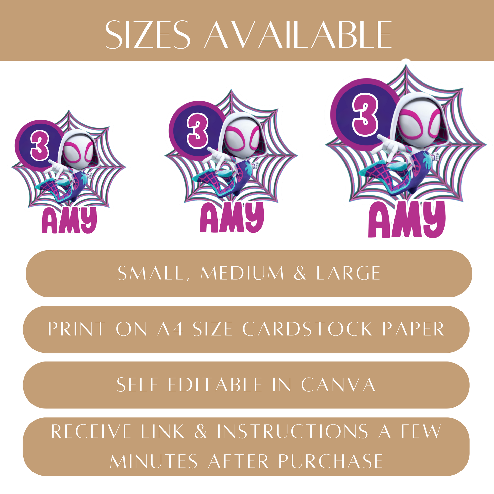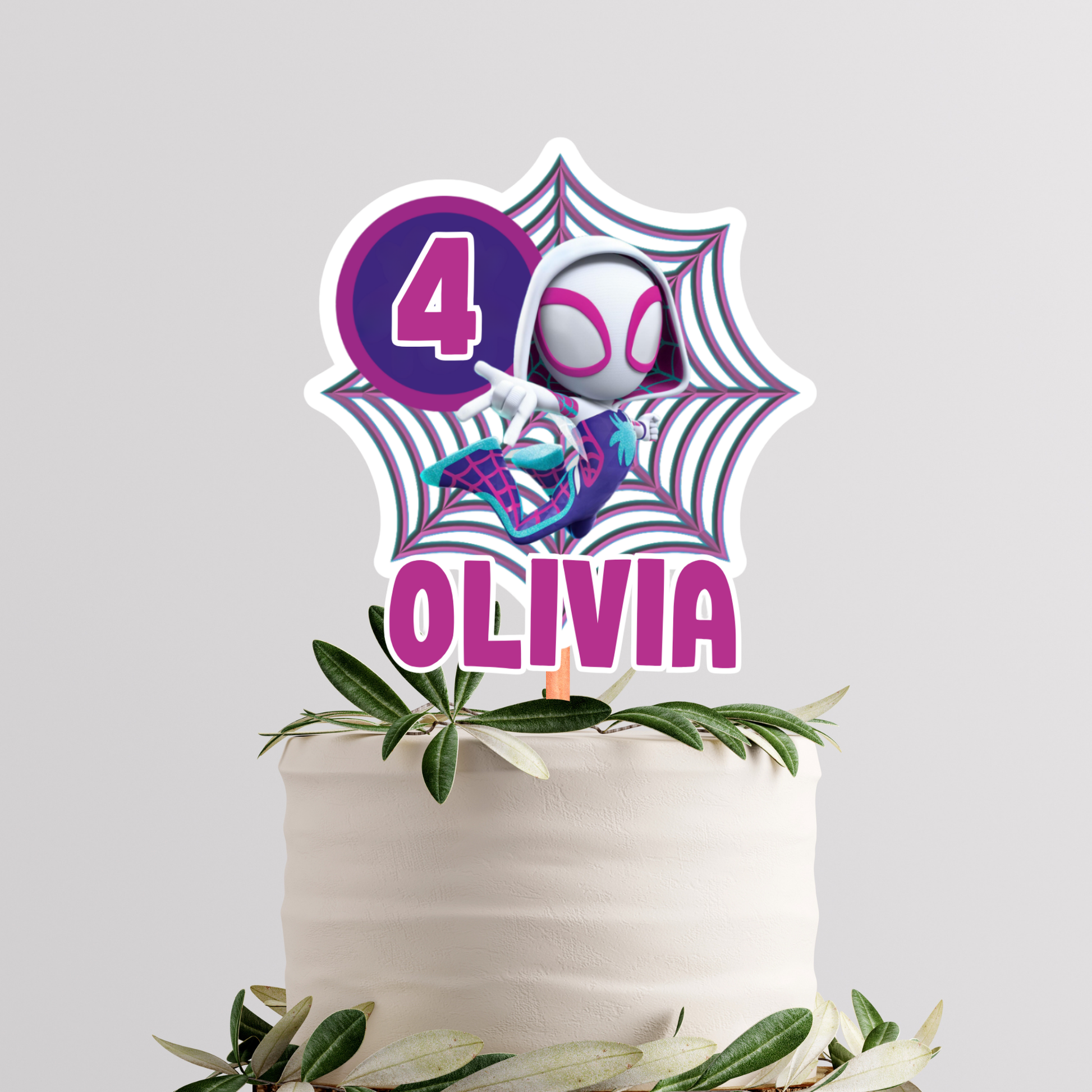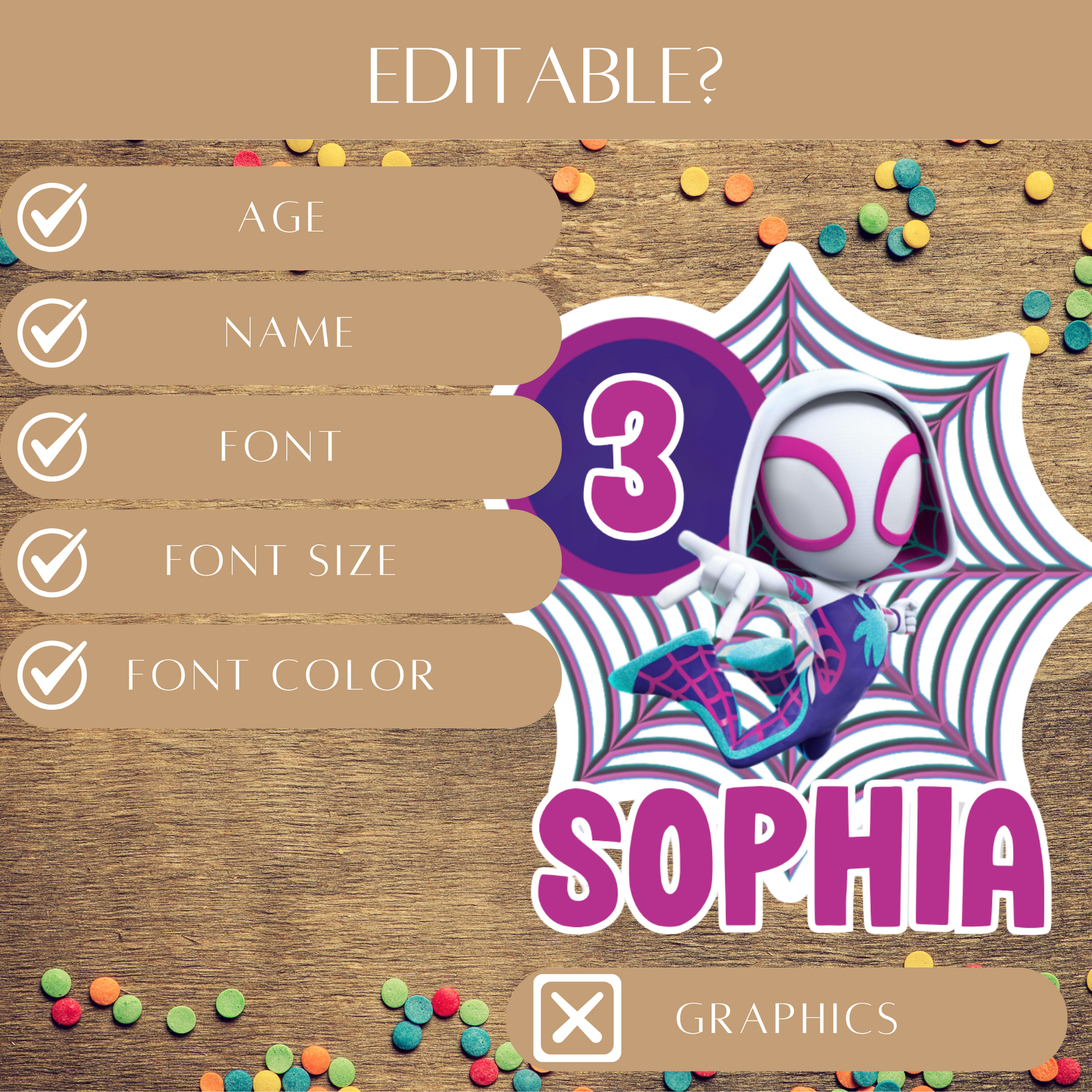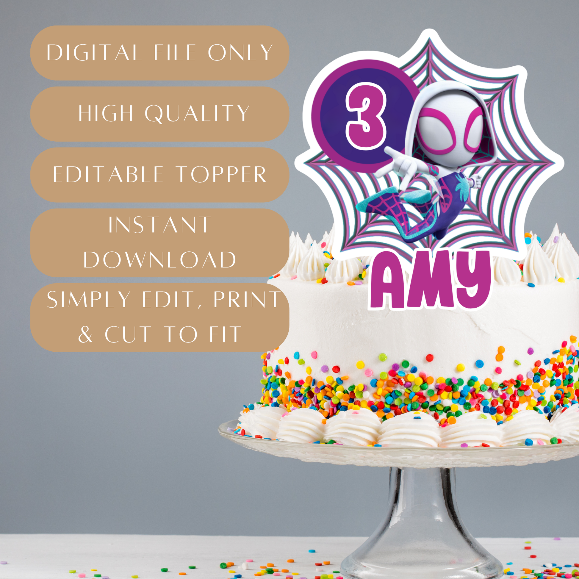 Add some superhero style to your celebration with this Editable Ghost-Spider Cake Topper, inspired by Gwen Stacy from Spidey and His Amazing Friends! This fun and vibrant topper is perfect for fans of the web-slinging heroine and makes a bold statement on any birthday cake.