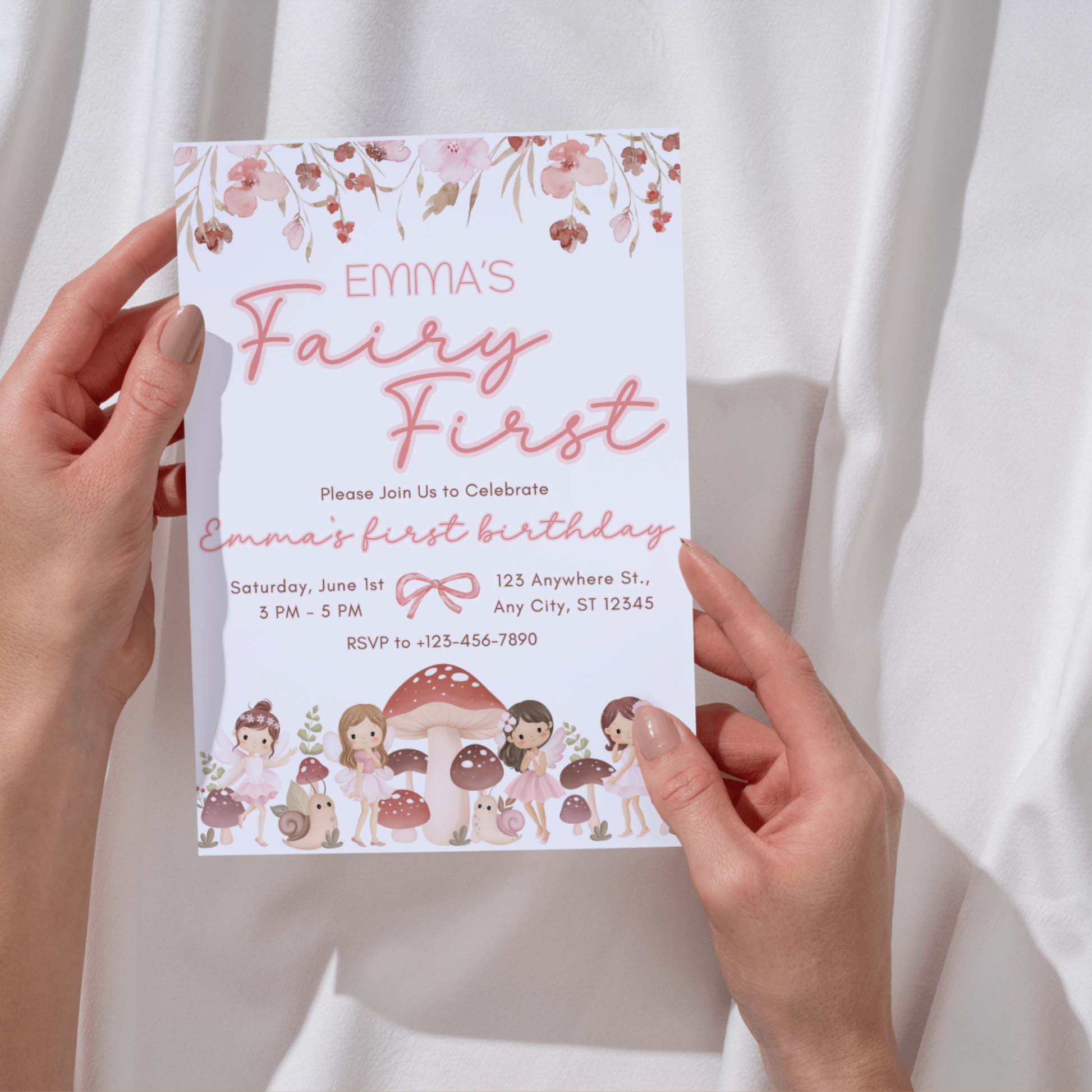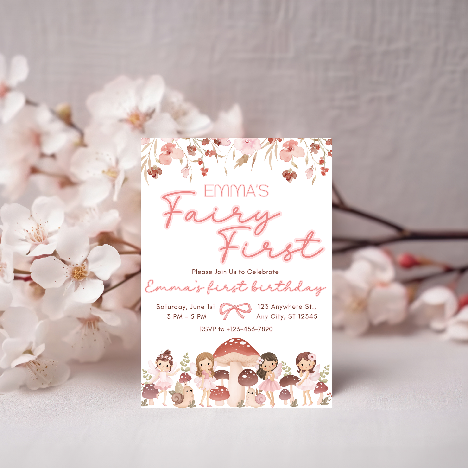 Make your little one’s first birthday truly magical with this dreamy “Fairy First” invitation—because every little fairy deserves a celebration that sparkles! 🧚🌸🎉