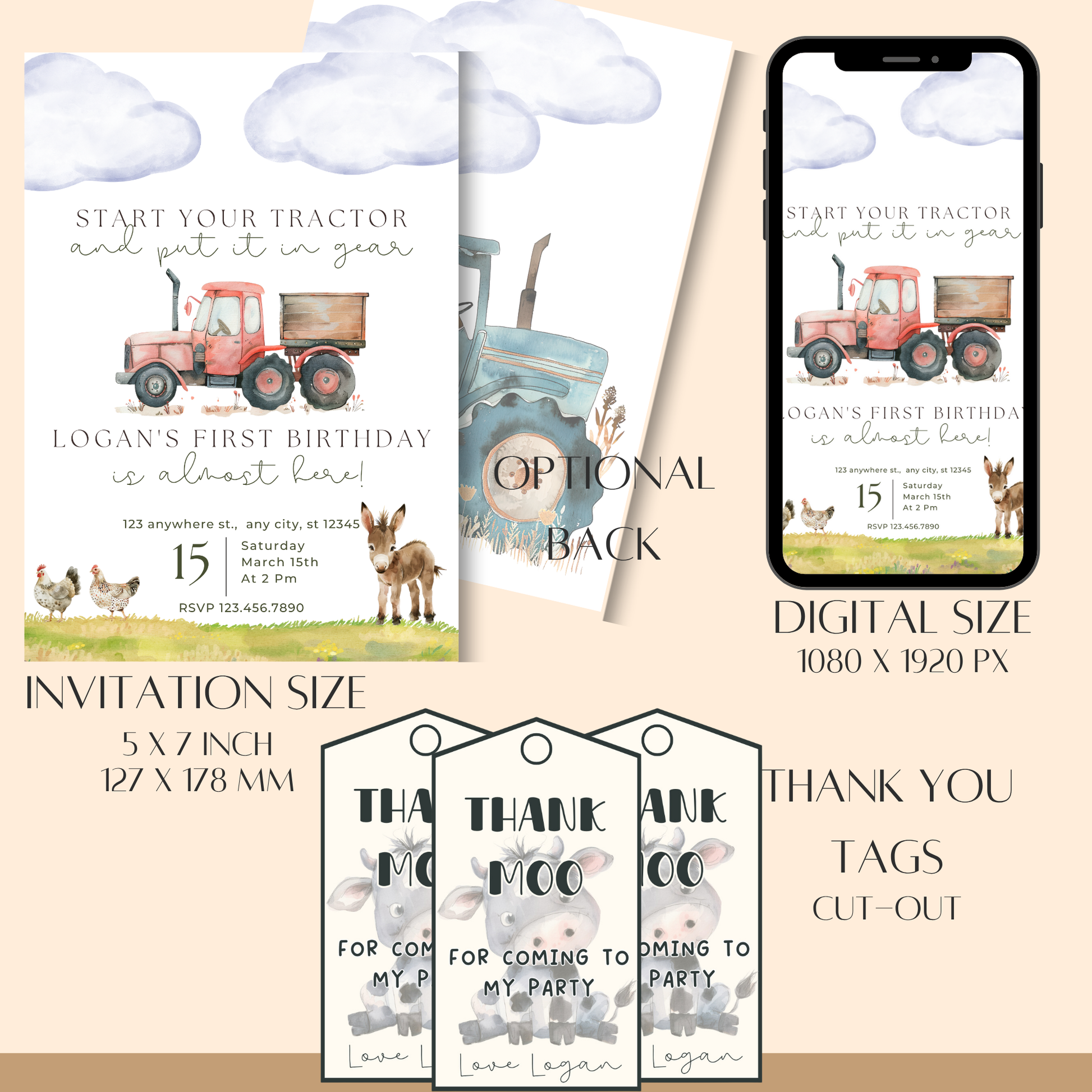 Celebrate your little one’s special day with this adorable Farm-Themed Birthday Invitation Template. Featuring cute barnyard animals, tractors, and classic country charm, this invite is perfect for a fun and festive farm-style celebration. Whether you're throwing a barnyard bash or a petting zoo party, this set includes both printable and digital invitations, plus matching thank-you tags for a coordinated and charming party look.