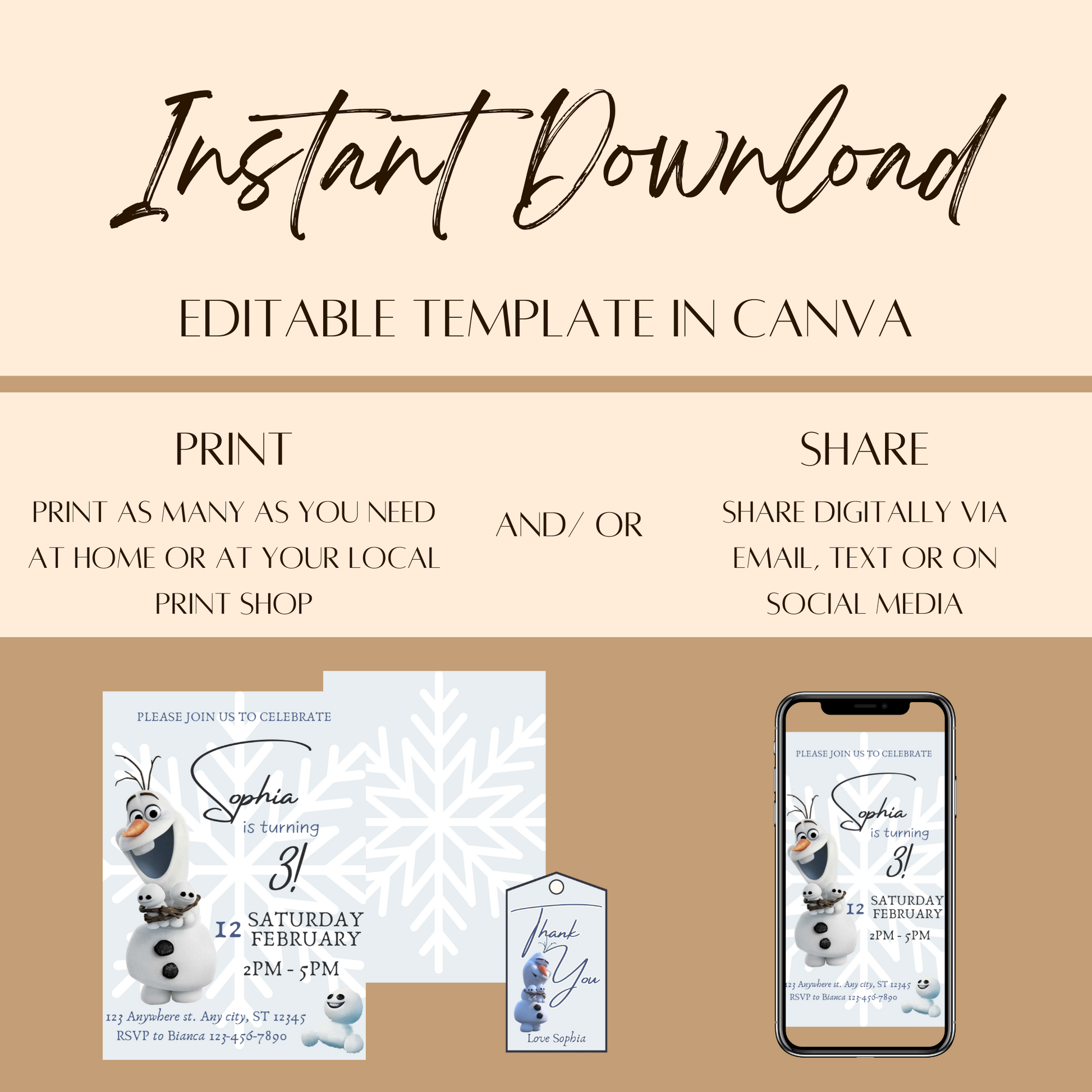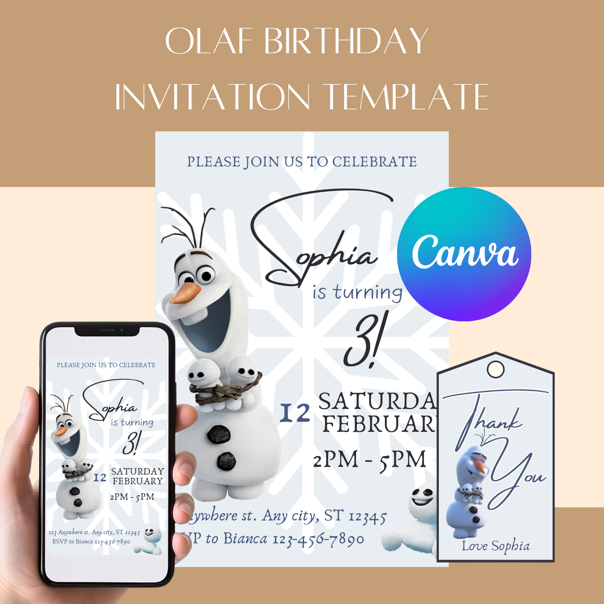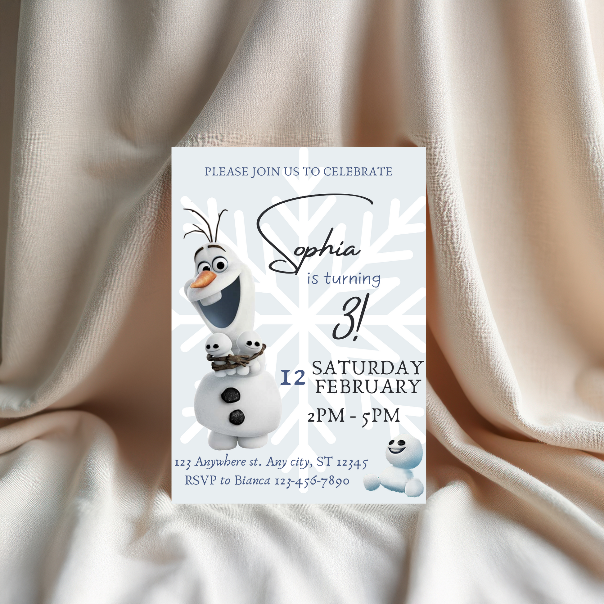 Get ready for warm hugs and cool fun with this Olaf-themed birthday invitation! ❄️⛄ Inspired by everyone’s favorite snowman from Frozen, this editable invite is perfect for kids who love Olaf’s cheerful spirit, snowy adventures, and magical winter vibes—even in summer!