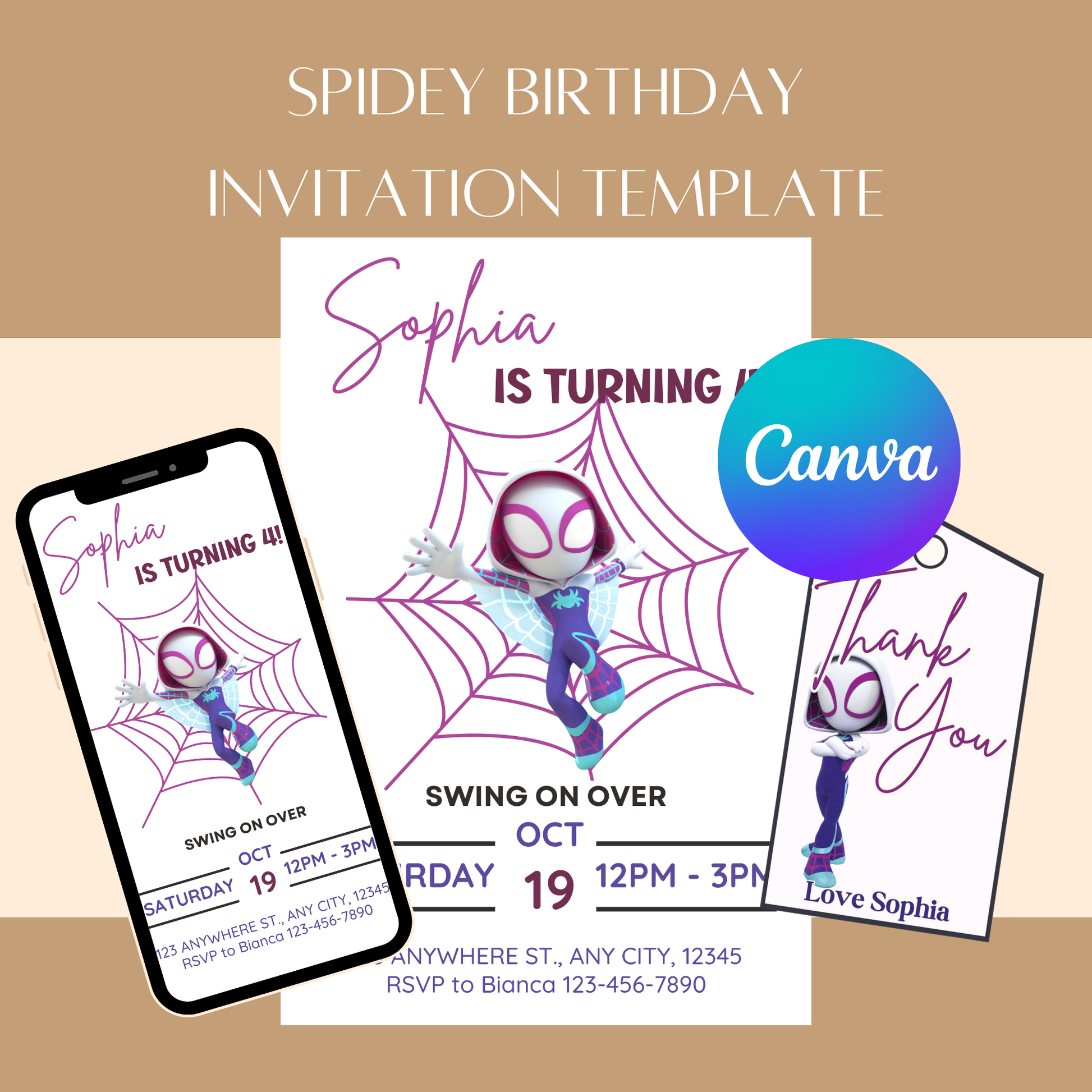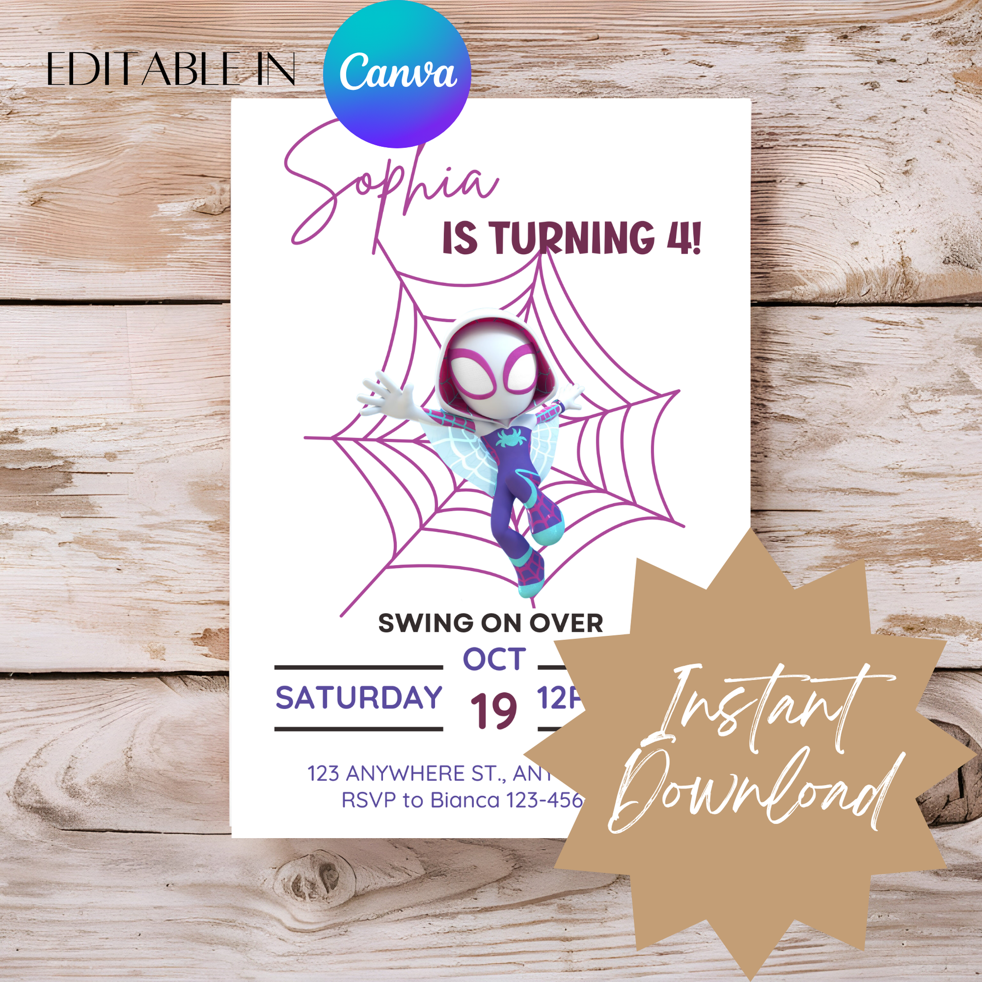 Swing into birthday fun with this Ghost-Spider themed invitation set! 🕸️💗 Inspired by Gwen Stacy from Spidey and His Amazing Friends, this editable and printable birthday invite is perfect for superhero-loving kids who are ready to save the day in style!