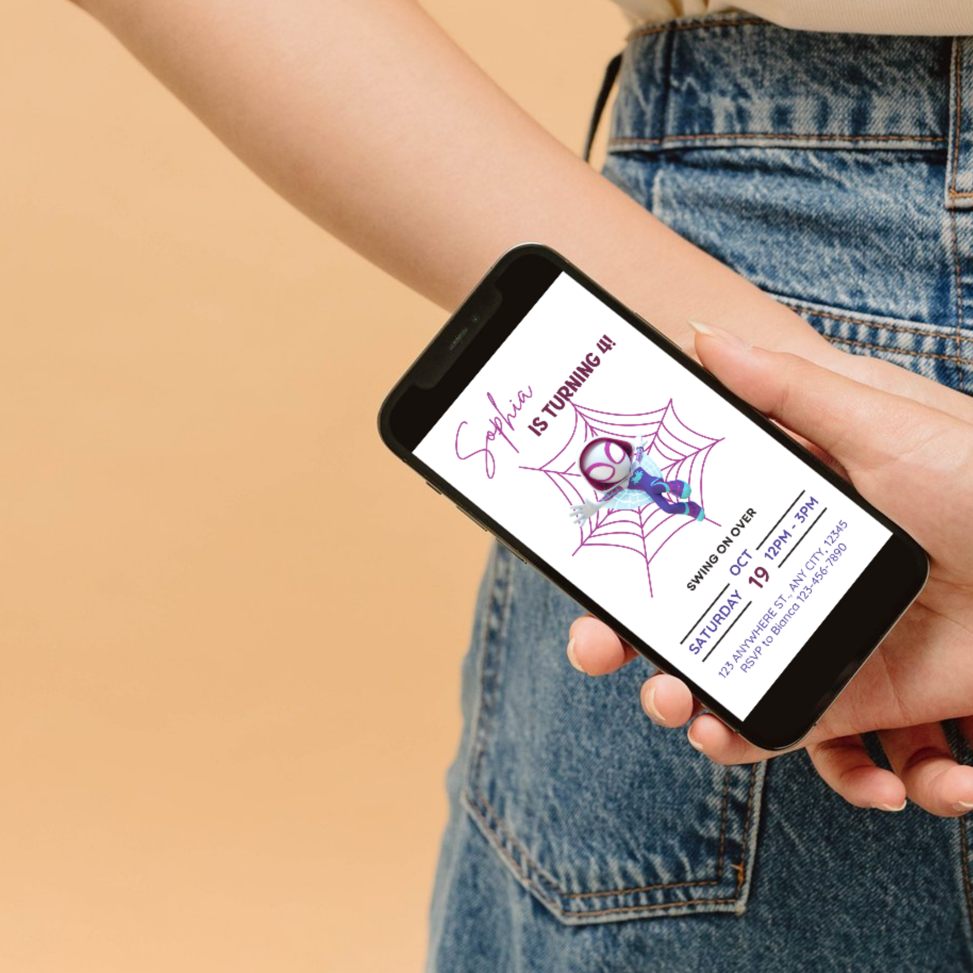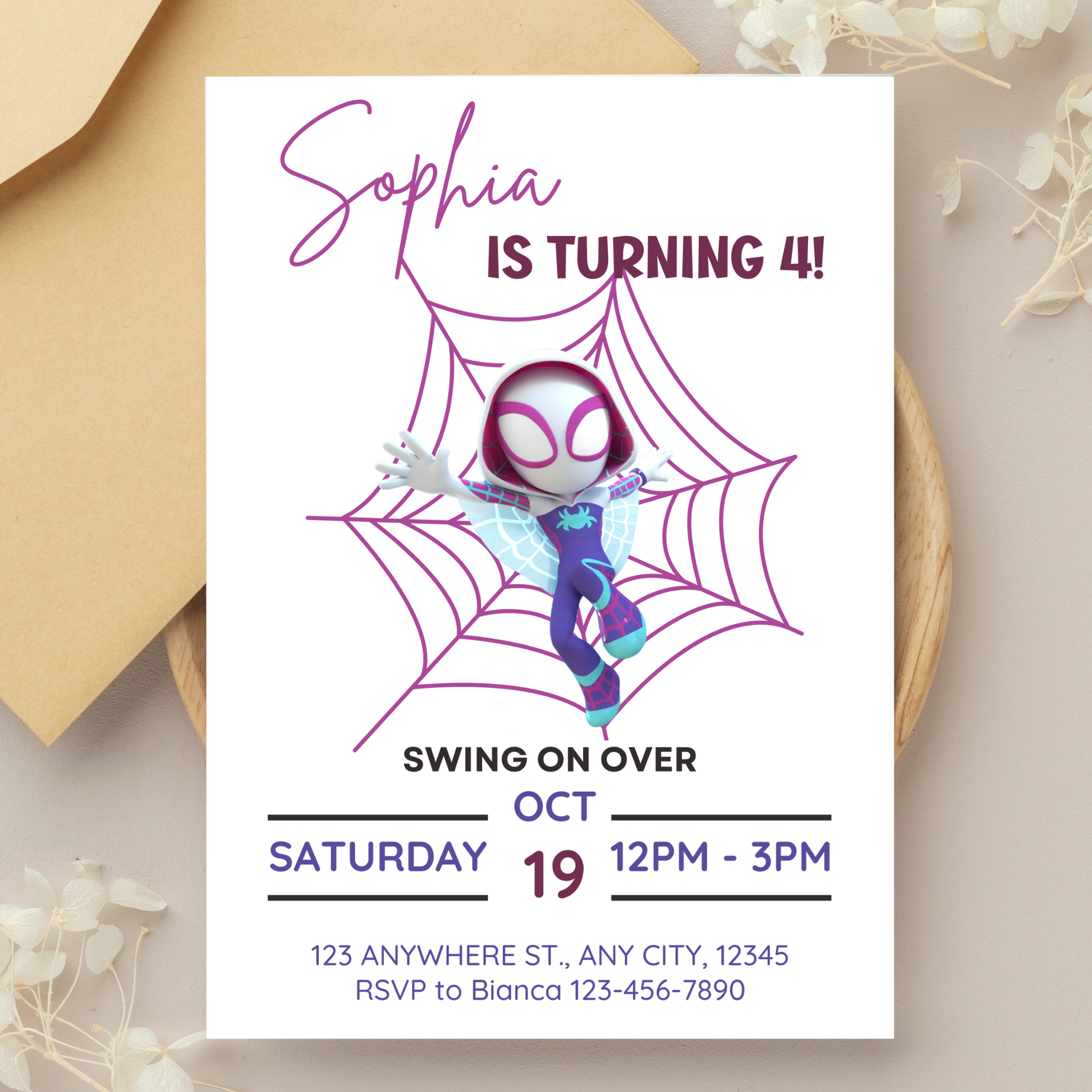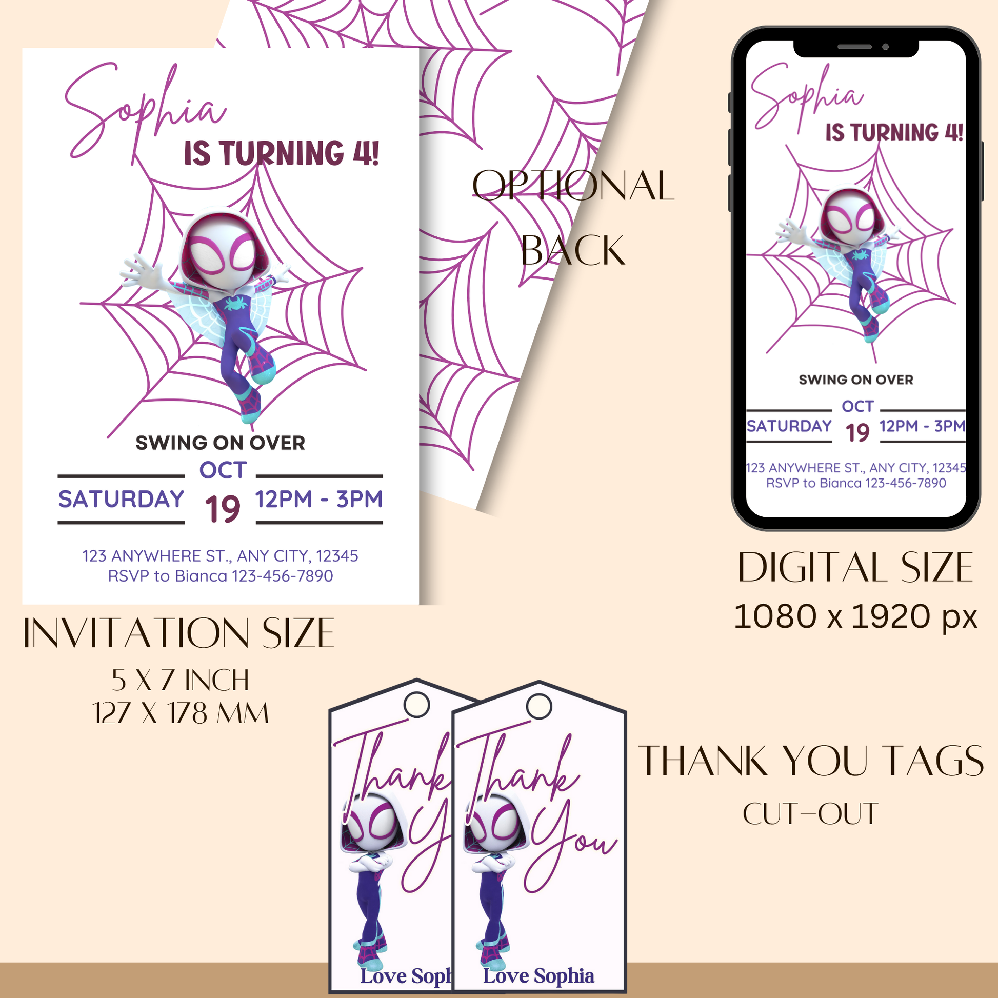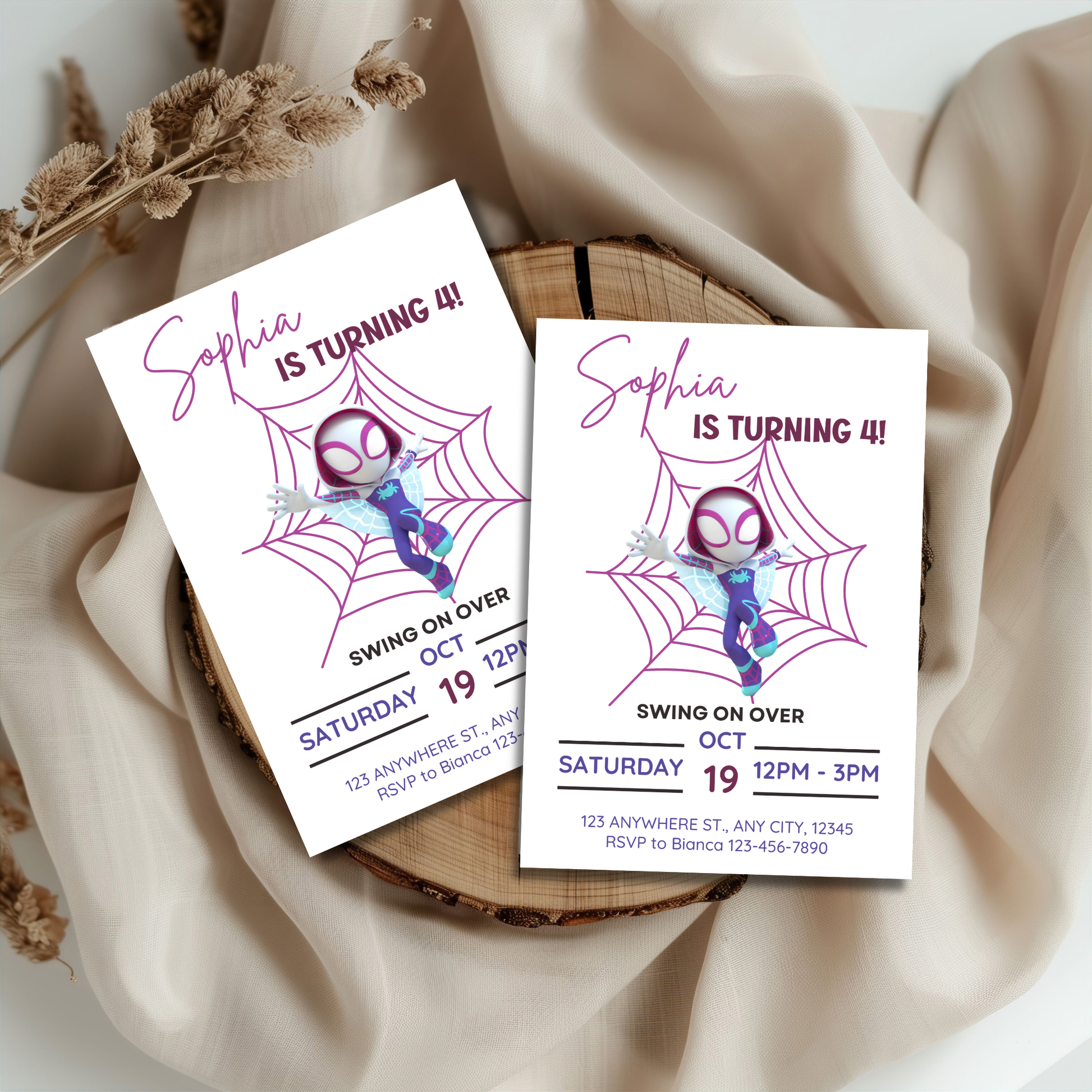 Get ready for a web-slinging celebration your little superhero will never forget with this Ghost-Spider birthday invitation set! 🕸️💗🦸♀️