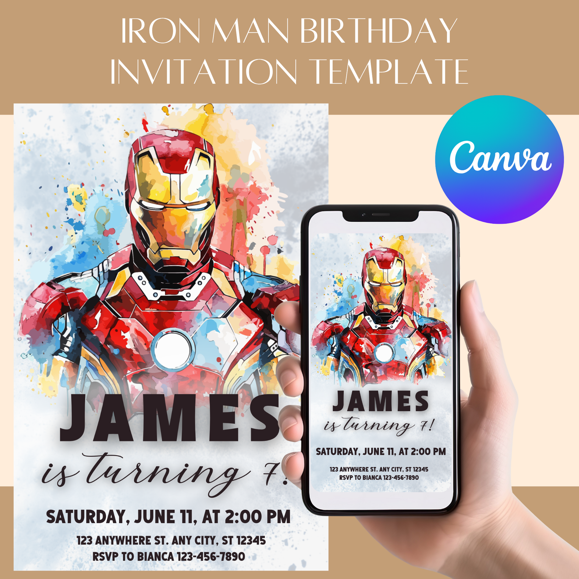 Get ready to assemble your guests for a heroic celebration with this fun and easy-to-edit Iron Man invitation! 🦾🛡️