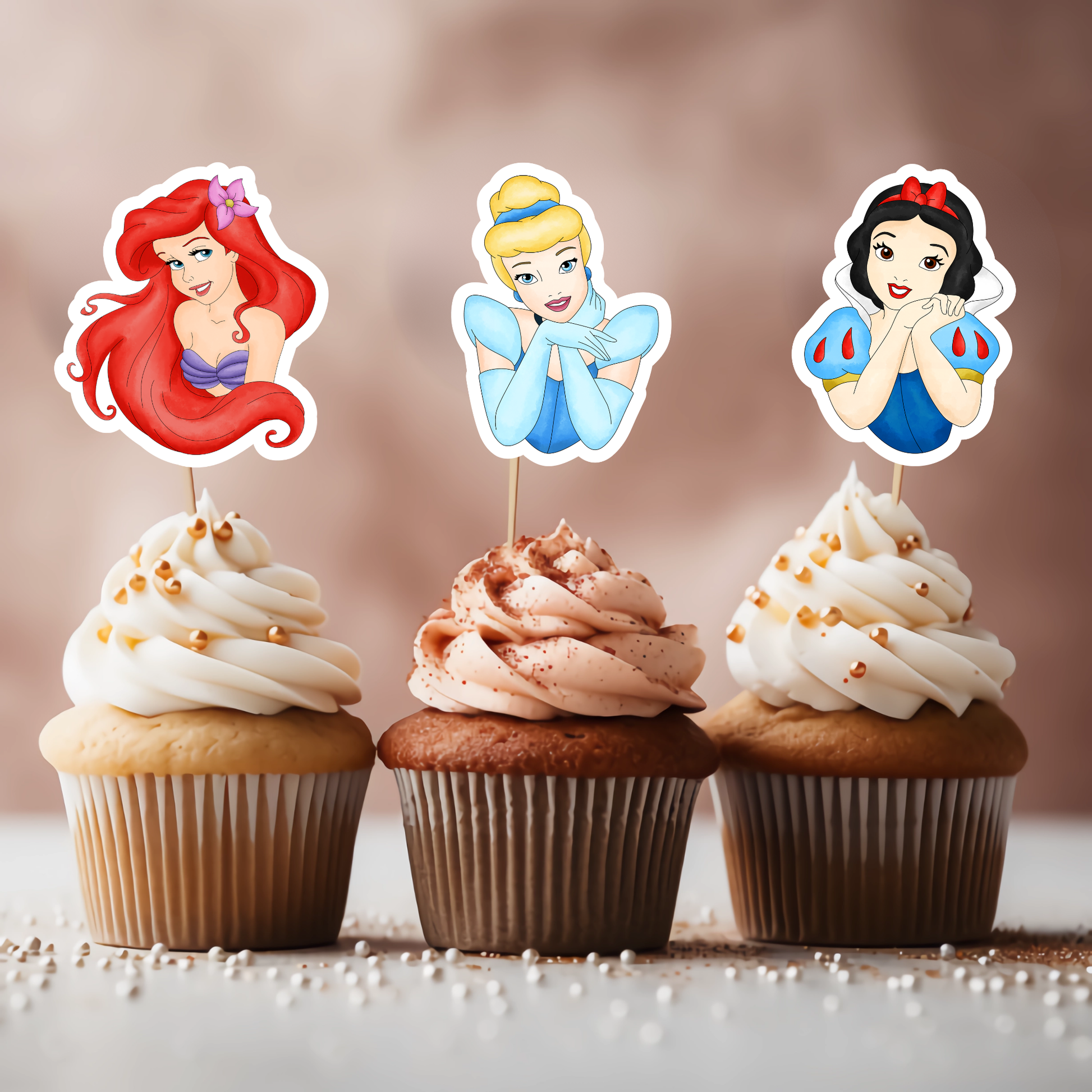 Create a magical dessert display and make your little oneโs royal celebration unforgettable with these charming Disney Princess cupcake toppers!