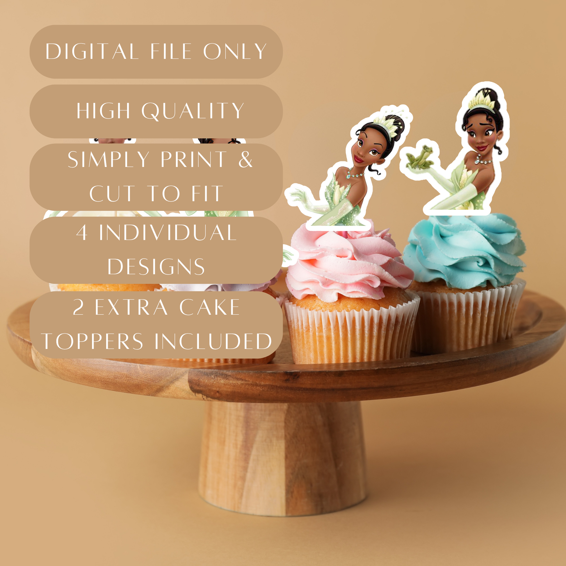 👑 Includes 4 beautiful Princess and the Frog designs – perfect for cupcakes, snacks, or party table décor.