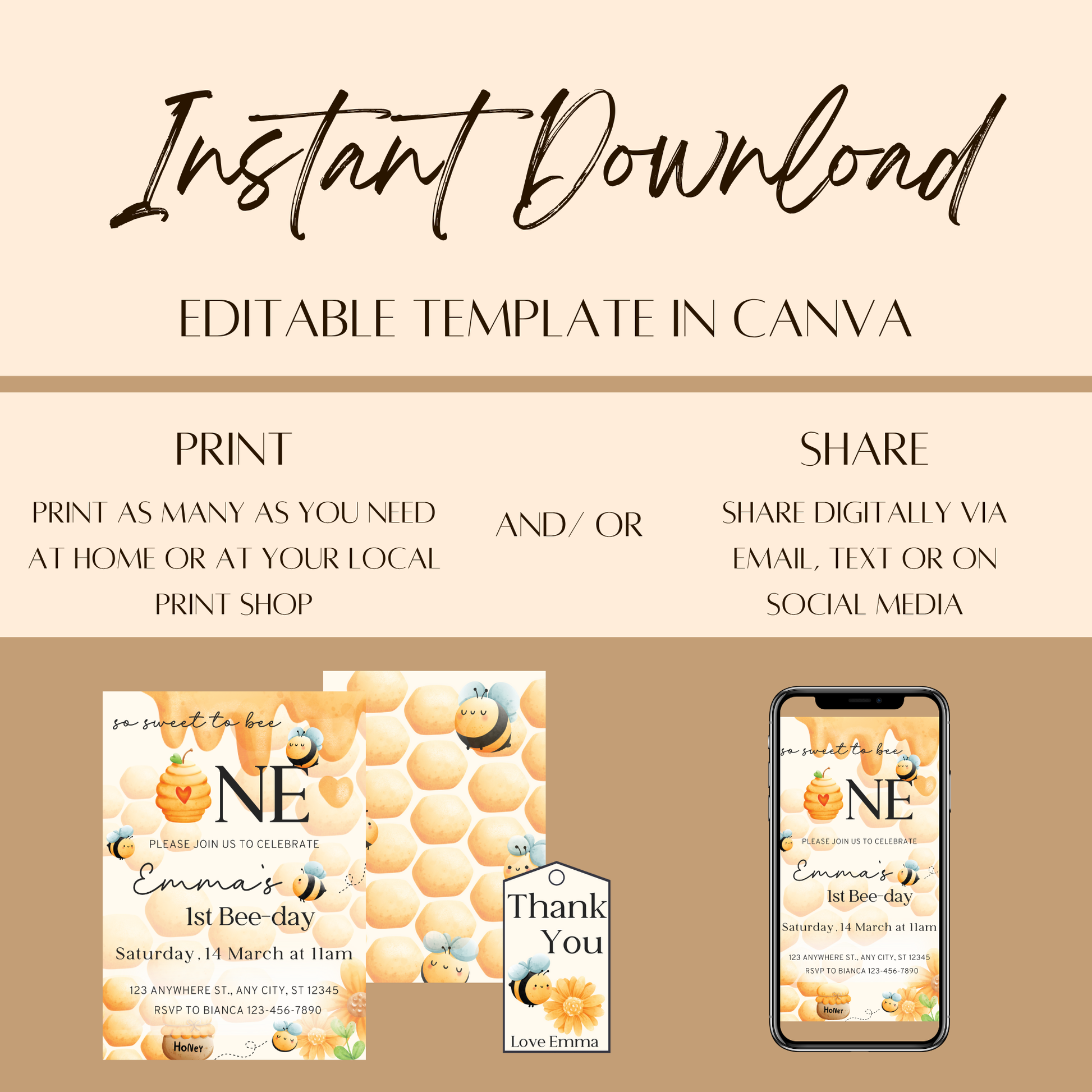 🐝 Editable in Canva – Personalize your child’s name, age, date, and party details with ease using Canva’s free online editor.